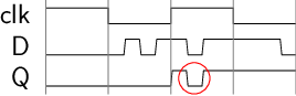 但是, D锁存器作为存储元件, 却无法满足同步电路的要求, 即使将时钟信号连接到D锁存器的写使能端, 也仍然不满足上述要求. 如下图所示, 我们期望数据在时钟上升沿到来时写入存储元件, 且在后续时钟周期能从存储元件稳定读出该数据, 但图中红圈处违反了该特性.
