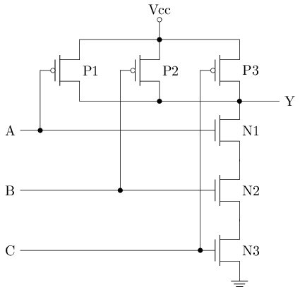 不难分析, 上述晶体管结构同样实现了三输入与非门的功能. 尝试对比两种实现方式中所需晶体管的数量.
