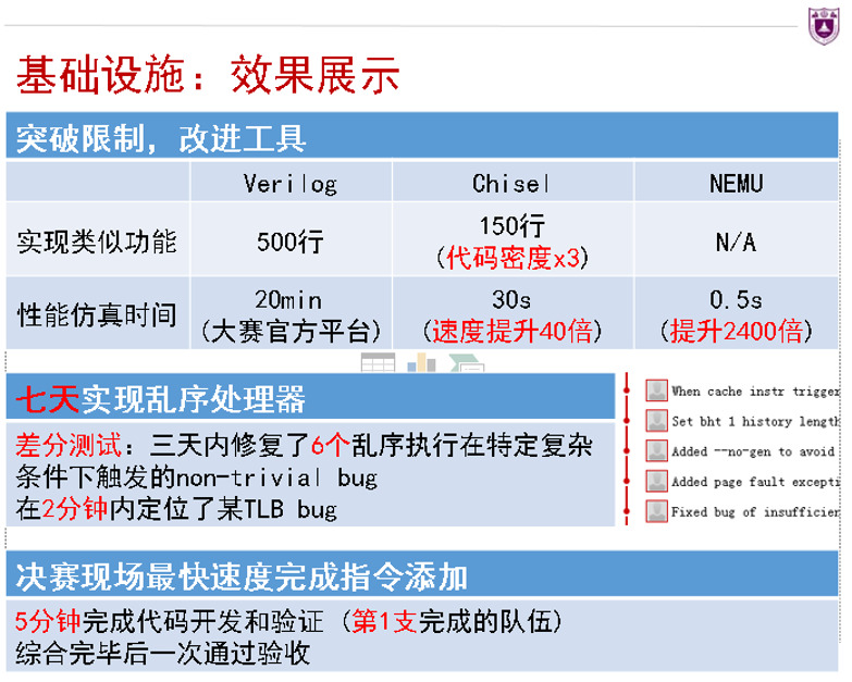 | 2018 | 南京大学参加龙芯杯 | 一周正确实现乱序发射乱序执行处理器, 并运行自制分时多任务操作系统和复杂应用仙剑奇侠传 |