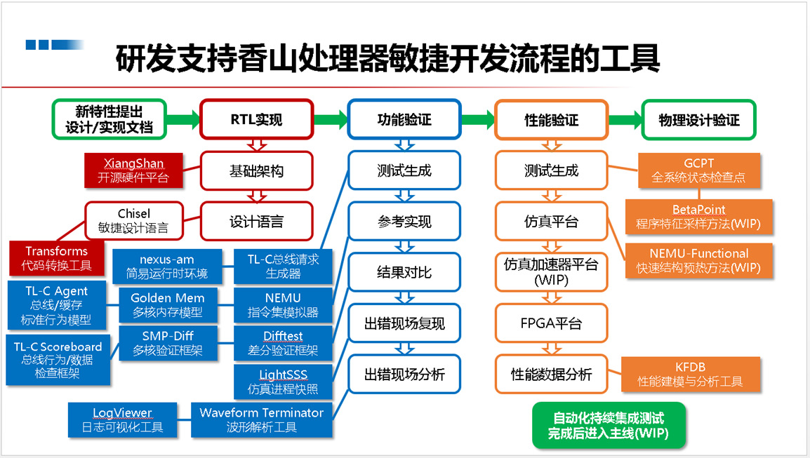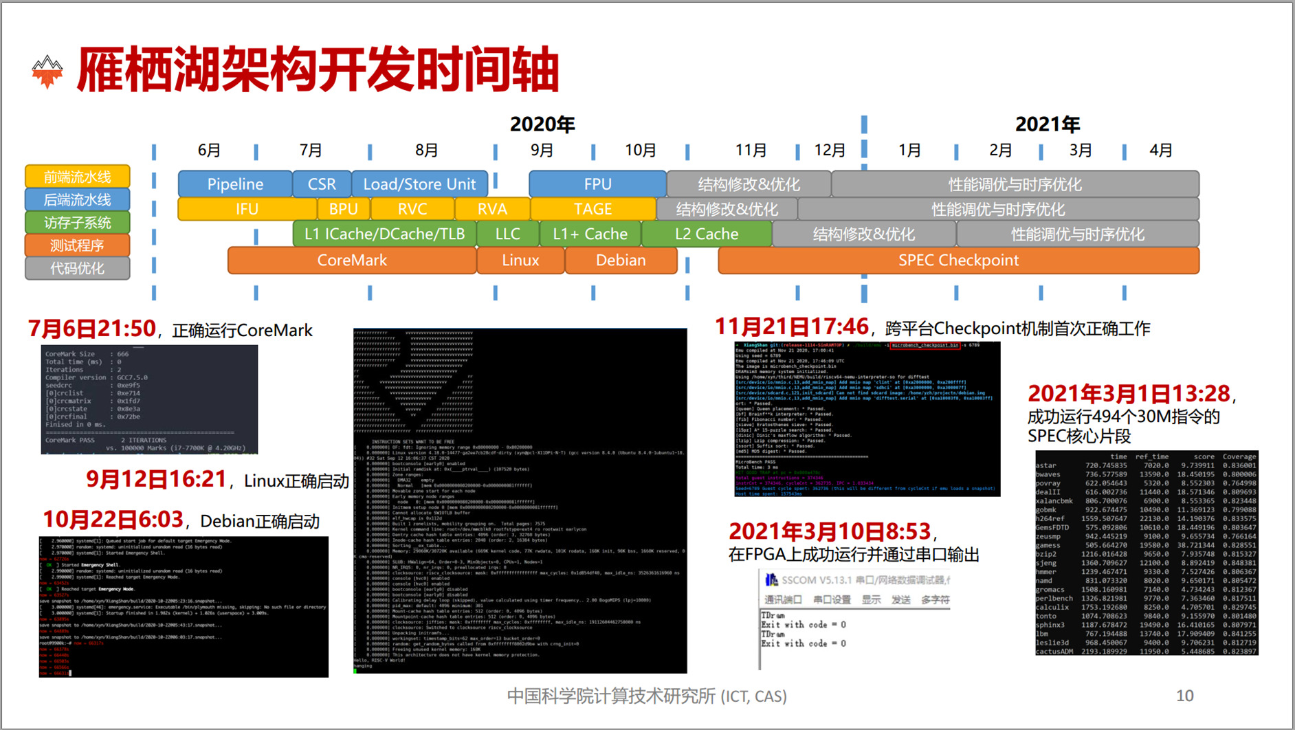 | 2021 | 开源高性能RISC-V处理器香山 | 成功启动SMP Linux; 环境就绪后首次上FPGA即可正确跑完所有SPEC 2006 REF测试, 无需在板卡上调试任何处理器相关的bug |